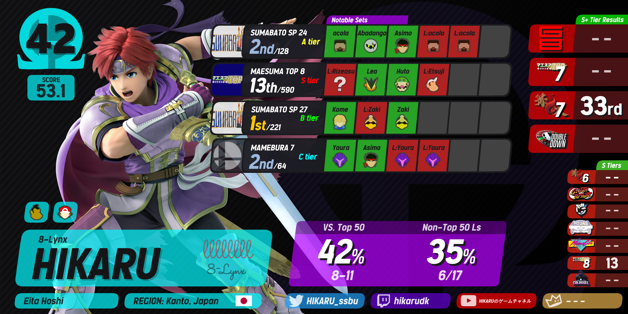 A staple force at tournaments across Japan, Eita “8LX | HIKARU” Hoshi is no stranger to global power rankings, and this season has been his best in Smash Ultimate yet. HIKARU’s peak is a 2nd place finish at Sumabato SP 24, where he defeated sssr 2-1, acola 2-1, Gurudan 2-0, Abadango 3-0, and Asimo 3-2 to make grand finals, before falling to acola 1-3 in both sets of grands. At other events throughout the season, he obtained wins on players like DIO, Huto, KEN, Lea, Toura, and Tsubotsubo. Though he primarily used Roy throughout this season, other characters also made an appearance, with his Donkey Kong notably winning 3-1 over Kome at Winners Finals of Sumabato SP 27.