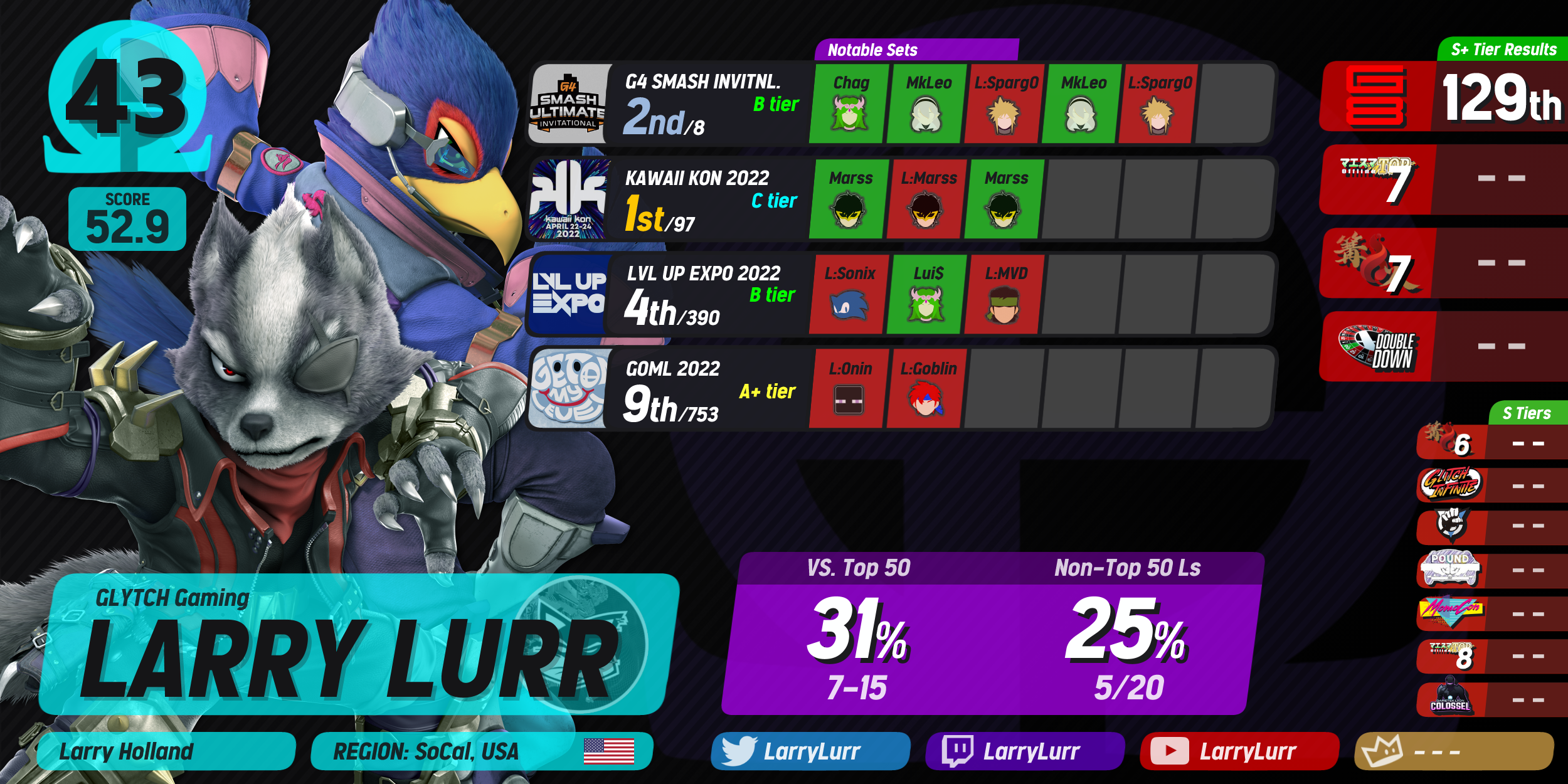 Although this season represents Larry’s best season since Ultimate began, it is not without some serious holes. All of his major results were underperformances, including a 9th place finish at GOML 2022 with a best win of Soar and a 17th place finish at Battle of BC 2 with a win on Ouch!? but a loss to Exodia, and he only attended one S tier event. His 129th finish at Genesis 8 is the sole triple digit finish at an ΩRank tournament for someone in the top 50, and although his loss record is generally good, losses to Plum and MoDzai at Genesis drag his season down substantially. Larry has shown shades of his former glory, but he will have to show them more consistently if he wants to once again rank much deeper within the top 50.