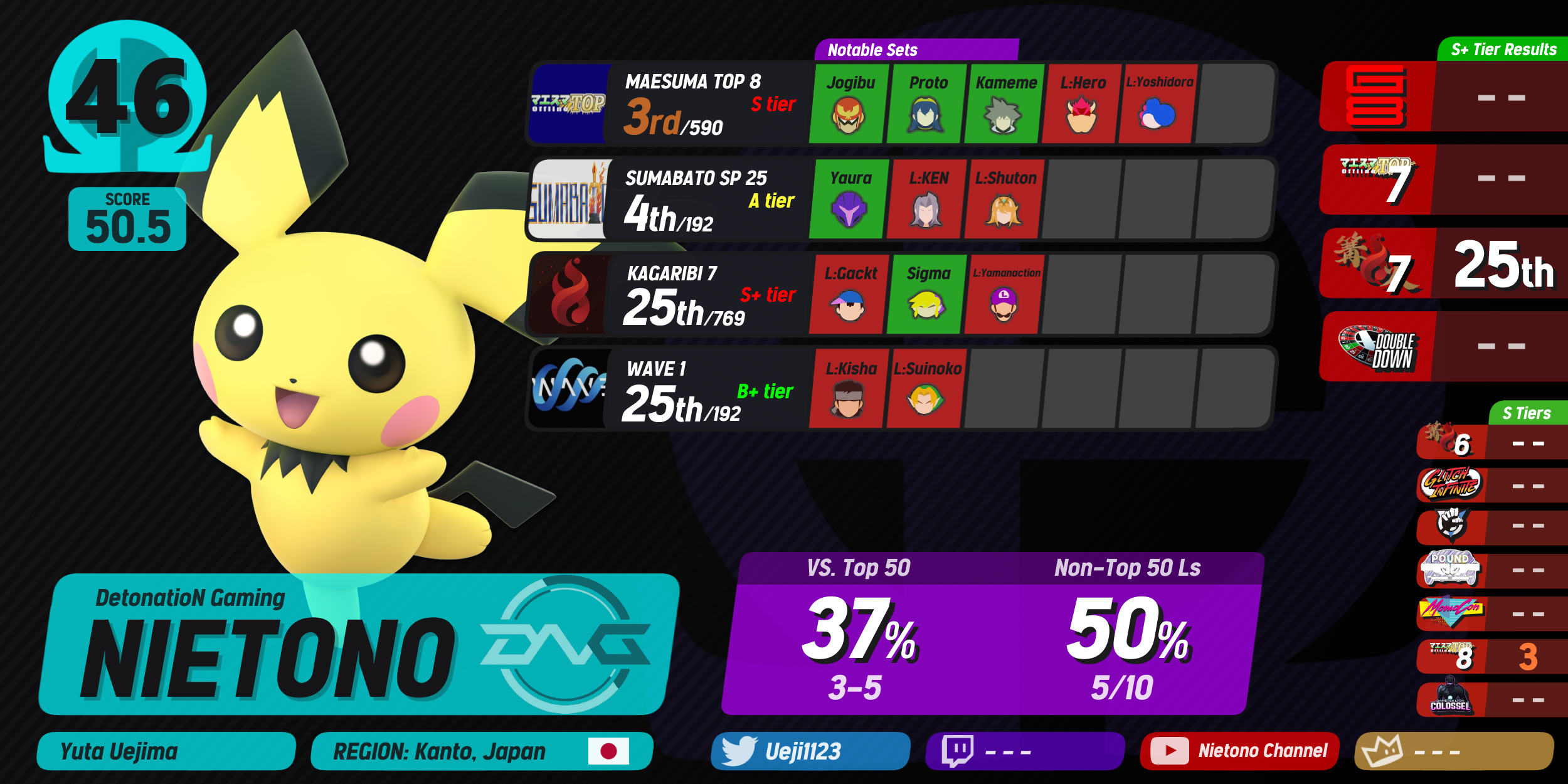Substantial underperformance at B tier events Wave 1 and Shinosuma HEROES left Nietono with 5 losses to players outside the top 100 and thus prevented an appearance deeper within the top 50, but his peaks ensure his skill is little in doubt. As his recent victory at Phantom 2022 to open the Fall 2022 season demonstrates, Nietono will keep tangling with the best for as long as there are Smash Ultimate tournaments to go to.