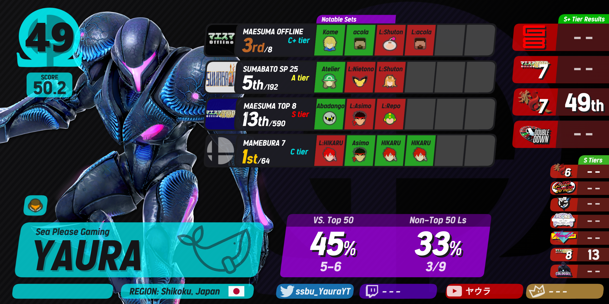 The best (Dark) Samus player in Japan, SPG | Yaura followed up an impressive breakout year in 2021 with continued success this year. Yaura’s best performance was at the first Maesuma Offline Invitational, where he defeated Kome 3-0 and acola 3-2 to make Winner’s Finals before losing 0-3 to Shuton and then losing the runback against acola in a heartbreaking reverse 3-0. As Yaura did not play acola again for the rest of the season, this makes him one of only three players, and the only player in the top 100, to have faced acola and not have a losing record against him. Across his other four events, Yaura scored wins on players like Abadango, Asimo, Atelier, HIKARU, Luminous, Taikei, and takera.