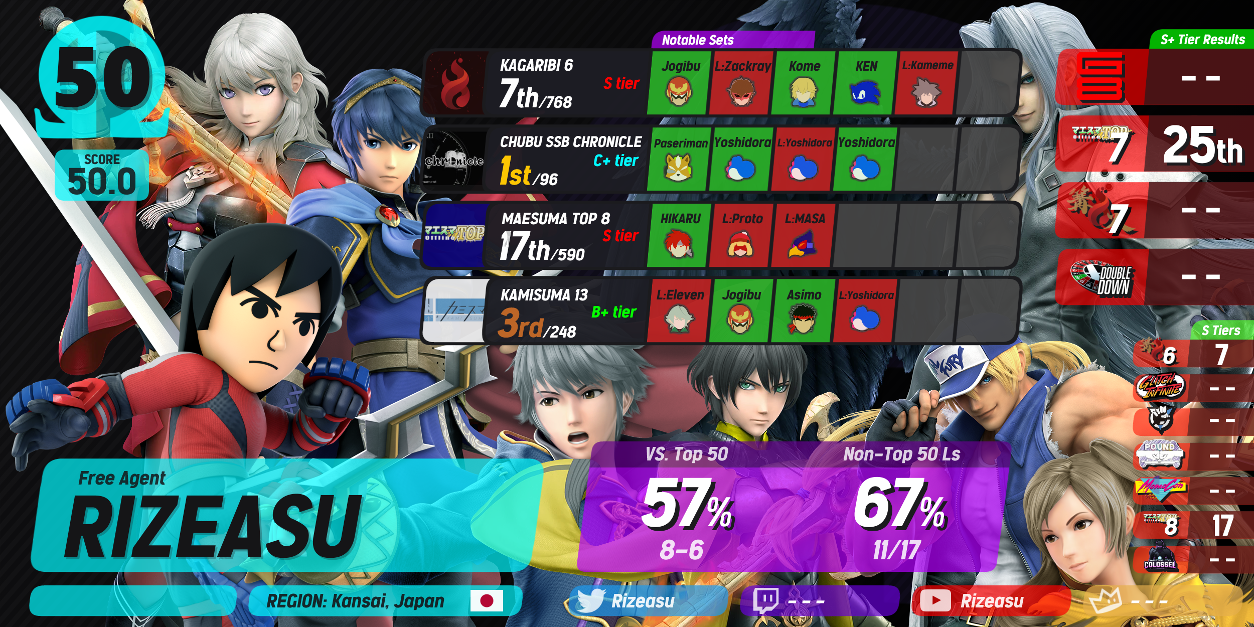 Rizeasu has been something of a mythical figure in the smash community since the Smash 4 years, a man who plays every character in the game and who doesn’t show up often but always brings an unpredictable roster of characters when he does. This past season saw both Rizeasu’s strongest performances so far as well as unusually high attendance, resulting in Rizeasu earning a spot in the top 50. His two strongest results were at S tier Kagaribi 6 and C+ tier Chūbu Smash Chronicle. The former saw Rizeasu defeat Jogibu, Tsu-, Kome, and KEN with an absurd cast of 5 different characters before falling to Kameme in a game 5 set. At the latter, he defeated Sidarezakura and Paseriman to make Winners Finals, then defeated Yoshidora twice to win the event. At Kamisuma 13, Rizeasu lost his round 1 to Kansai 1-2er Eleven using Cloud and Shulk, then won 12 sets in losers over the likes of Jogibu, Omuatsu, Rido, and Asimo to make Losers Finals. Other events throughout the season included wins on players like Levi, Shirayuki, sssr, and Tsuna.